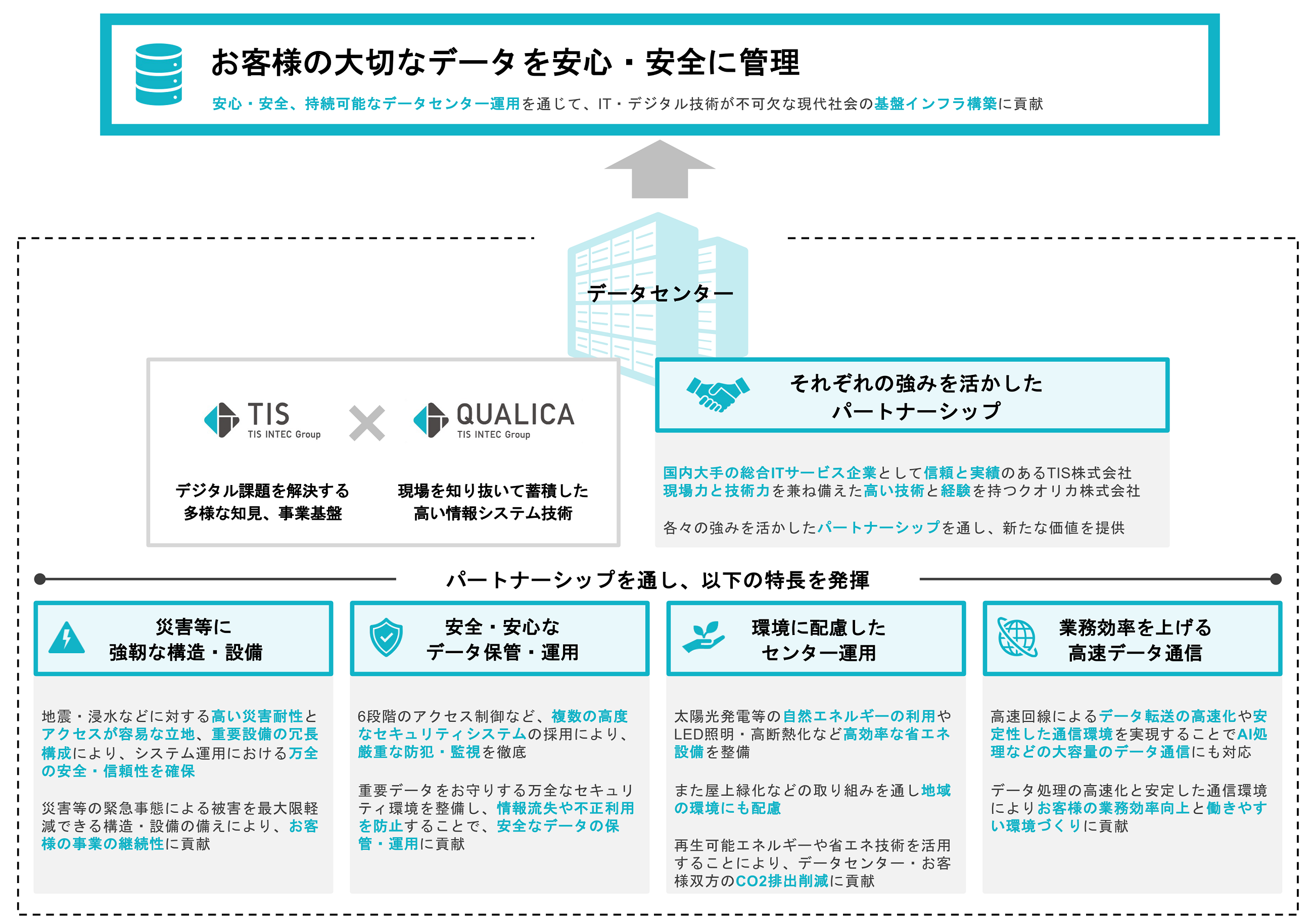 データセンターサービスは企業のITシステムやデータの利活用において不可欠なITインフラとなっていますが、環境負荷や災害リスク、セキュリティ・事業継続性の課題が常に存在しています。クオリカはTISインテックグループと連携し、最新の省エネ・環境配慮型データセンターへサービス基盤の移転を進めています。これにより、エネルギー効率向上やCO₂排出削減に貢献しています。また、地震や水害などの災害に強い立地・建物設計により、事業継続性や安全性も向上。万全の防犯監視システムによるセキュリティ体制やお客様要望に柔軟かつ迅速にこたえる運用体制により、安心・安全なITインフラを提供しています。